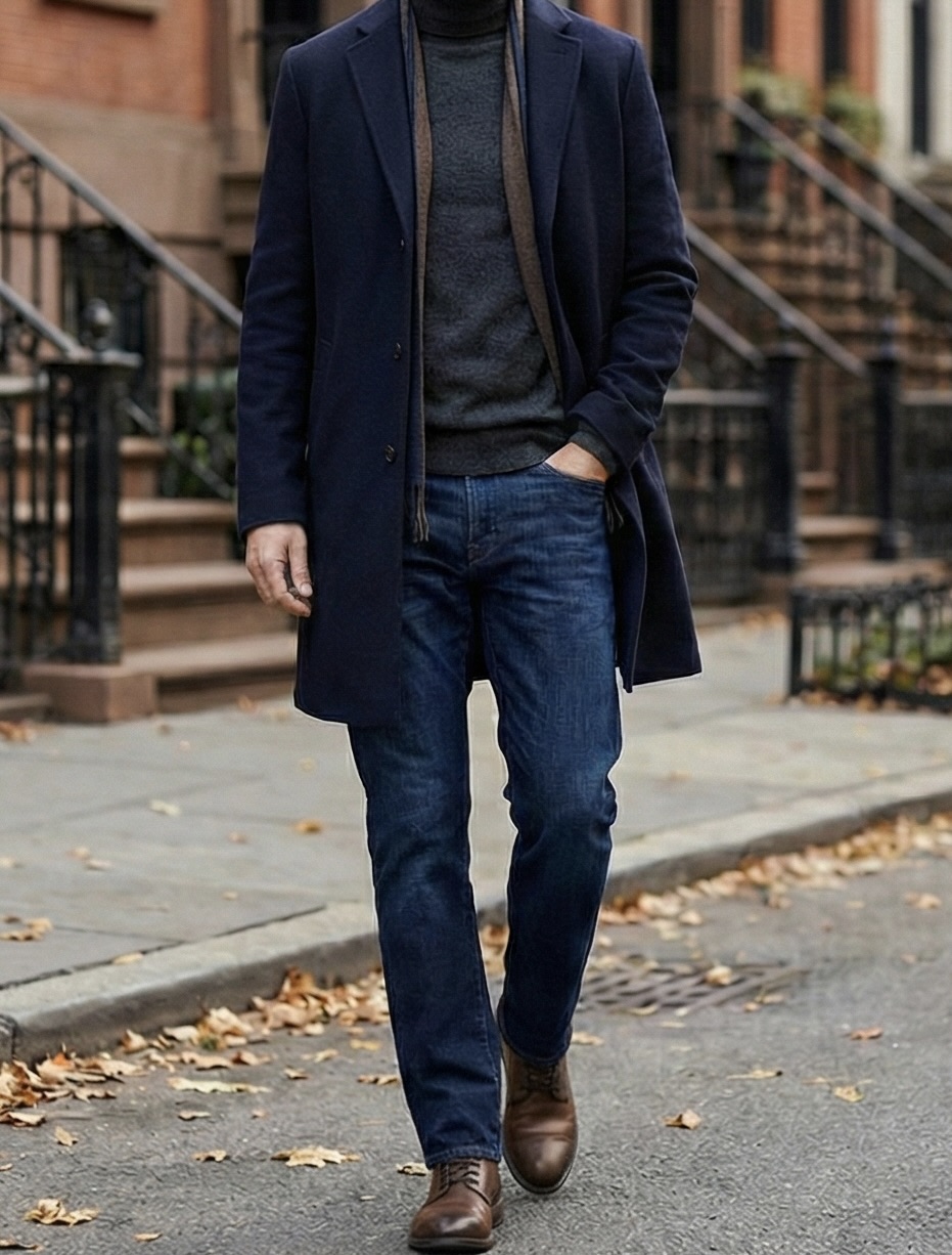 • 【冬】 ユニクロジーンズ + ハイゲージのタートルネックニット + シンプルなコート