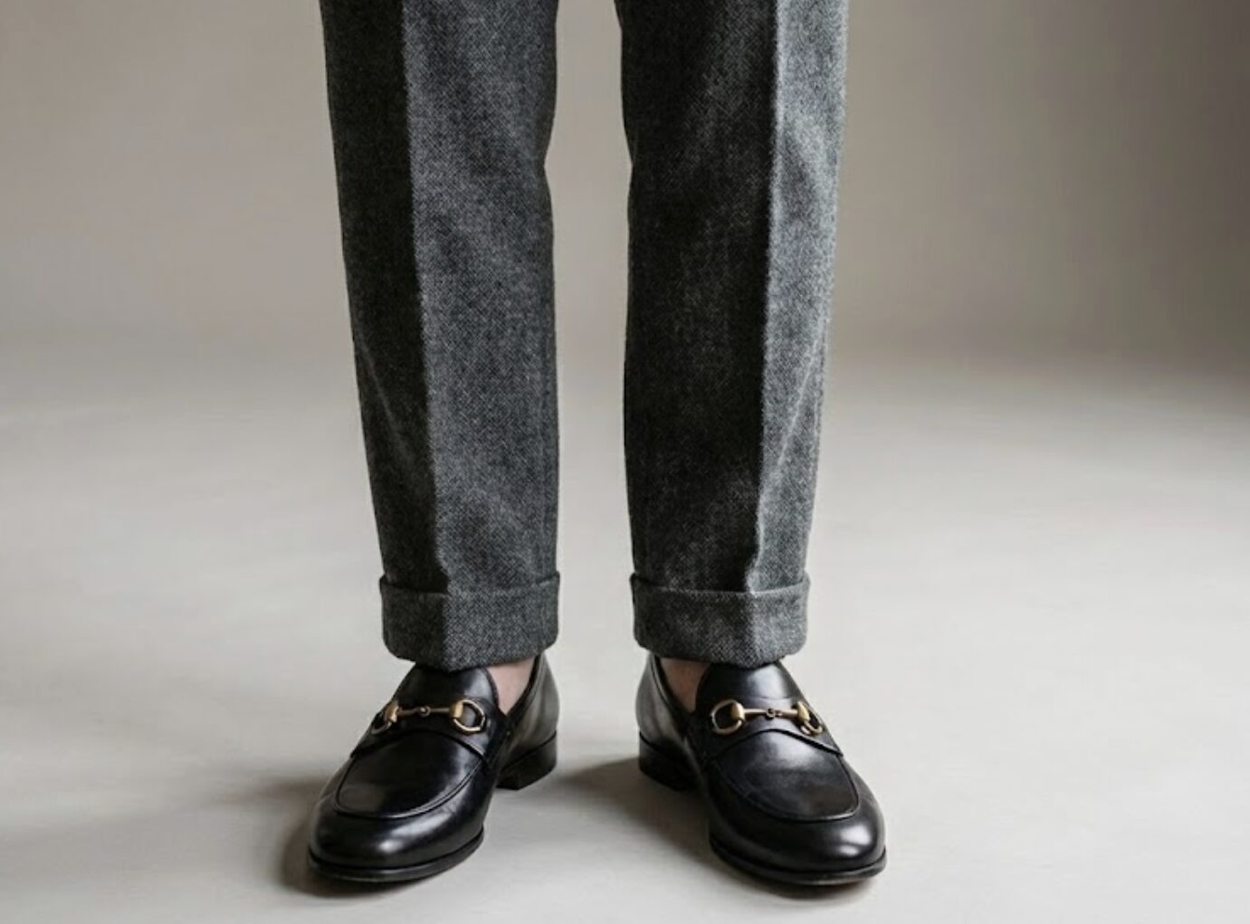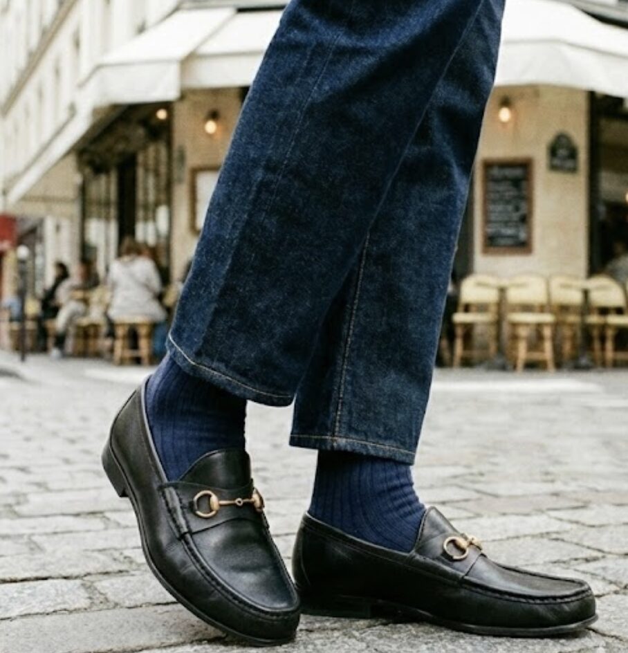 あえて靴下を目立たせないことで、ビット(金具)の輝きだけが浮き上がり、洗練された印象になります。