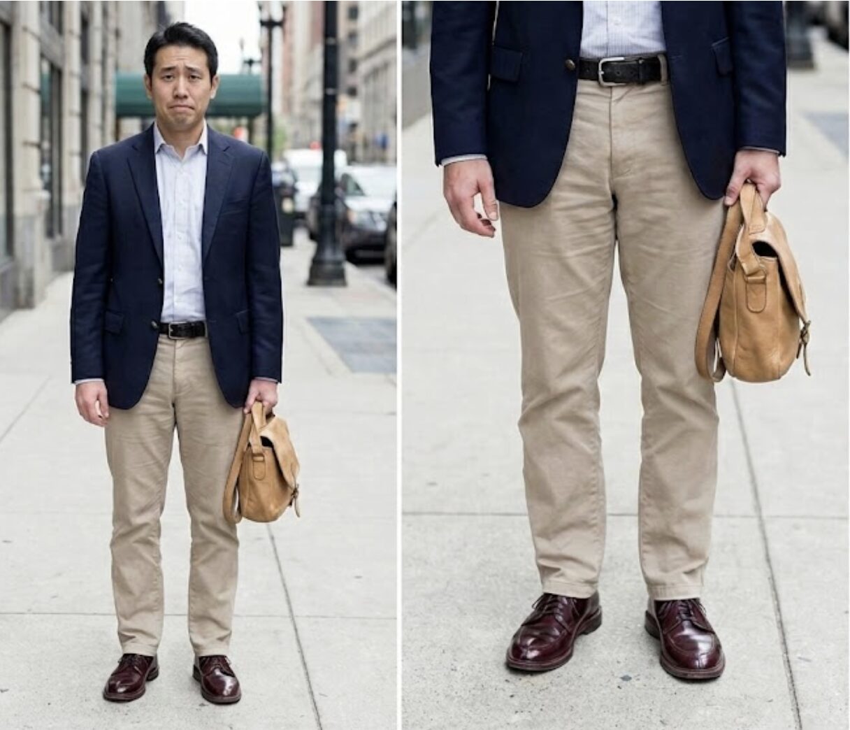 これでは、視線がバラバラに分散してしまい、 せっかくの高級靴も「浮いて」見えてしまいます。
