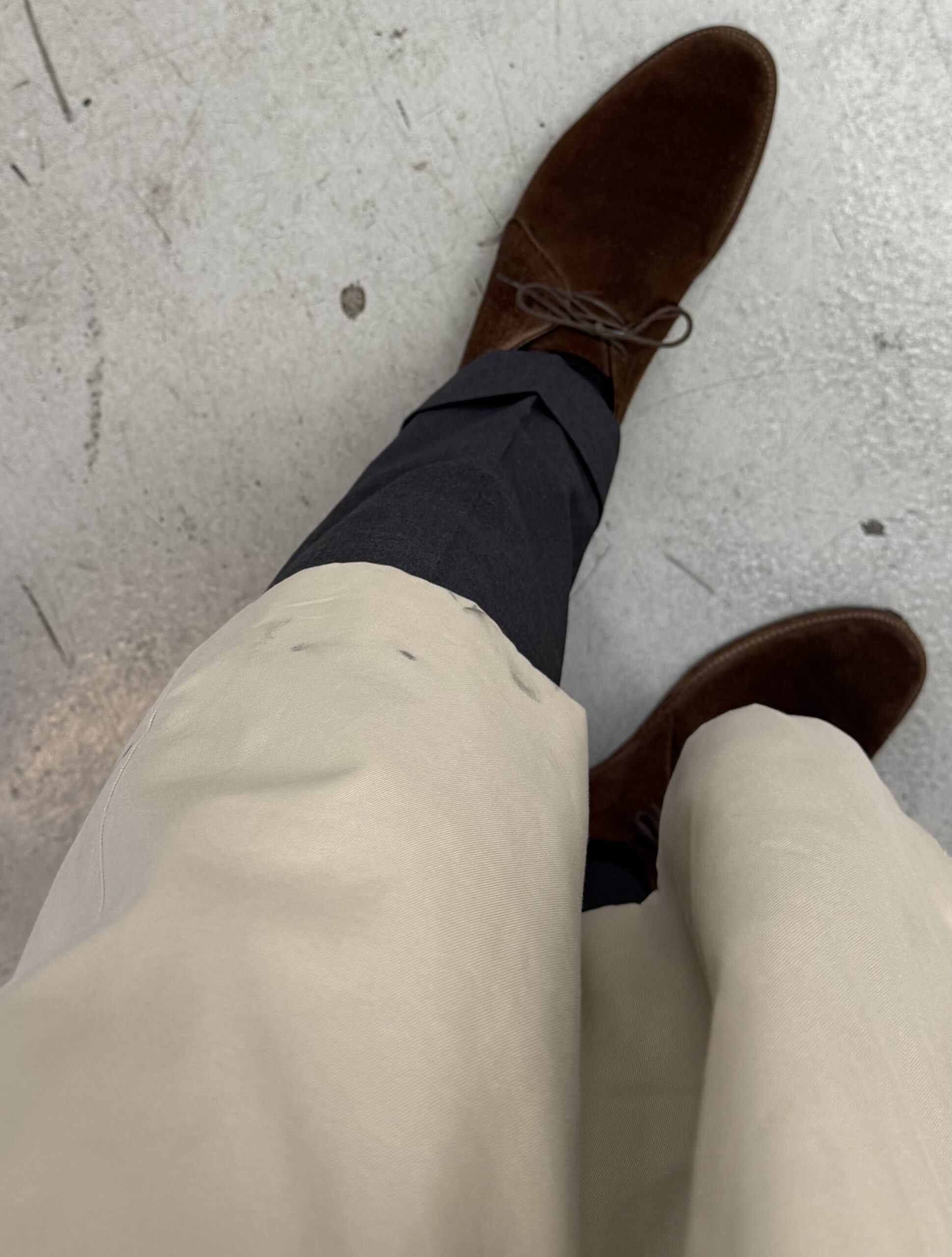 スエードは光を吸収するため、同じ茶色でもトーンが一段沈んで見え、ネイビージャケットやグレースラックスに柔らかく馴染む作りになっています。