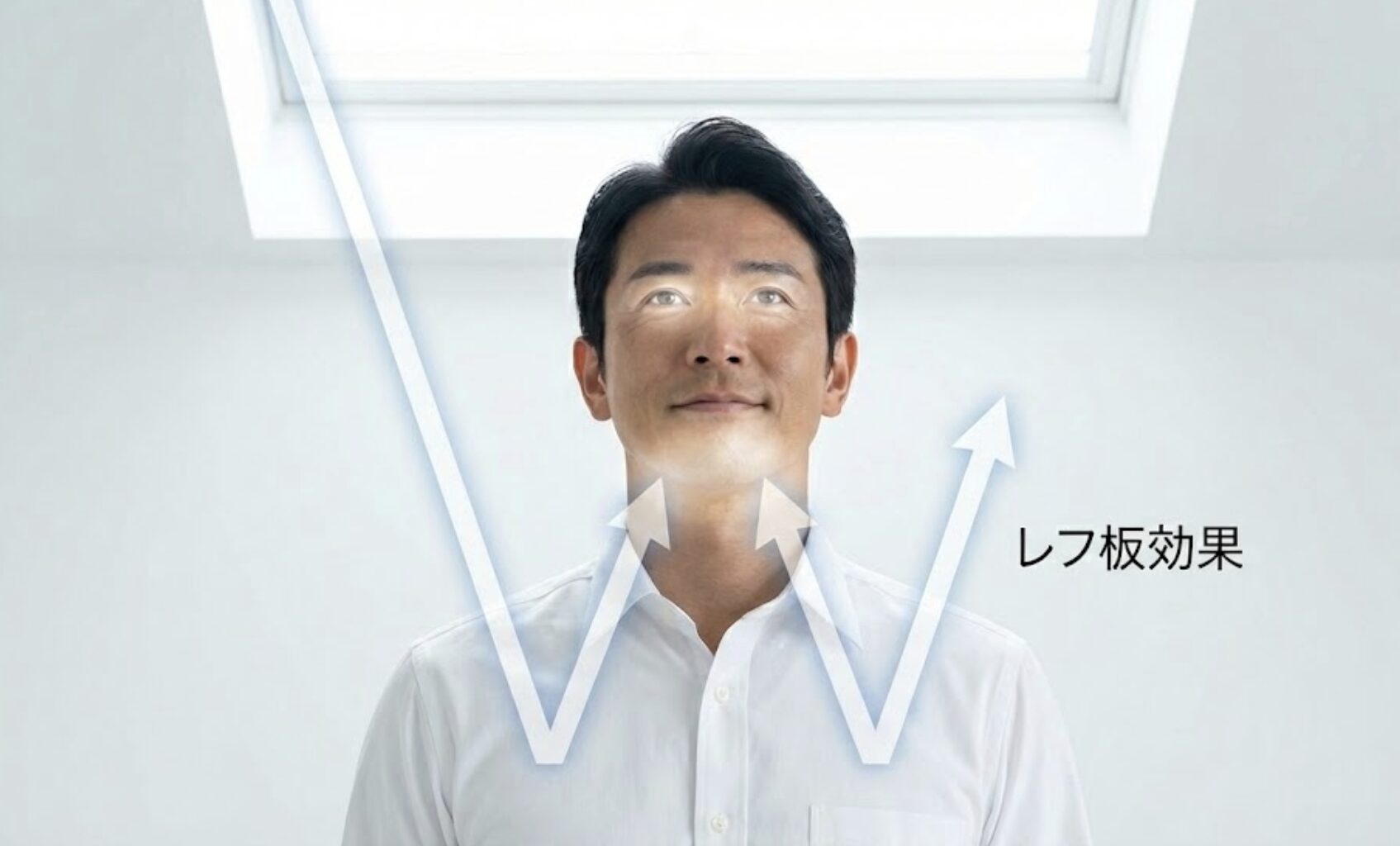 写真撮影の時に、モデルの顔の下に白い板(レフ板)を置いて光を反射させますよね。