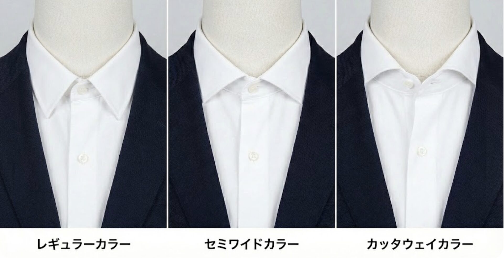 ネクタイをしない時、一般的なスーツ用の「レギュラーカラー(襟の開きが狭いもの)」を着ると、襟がジャケットの中にペチャっと潰れて隠れてしまい、非常に貧相に見えます。