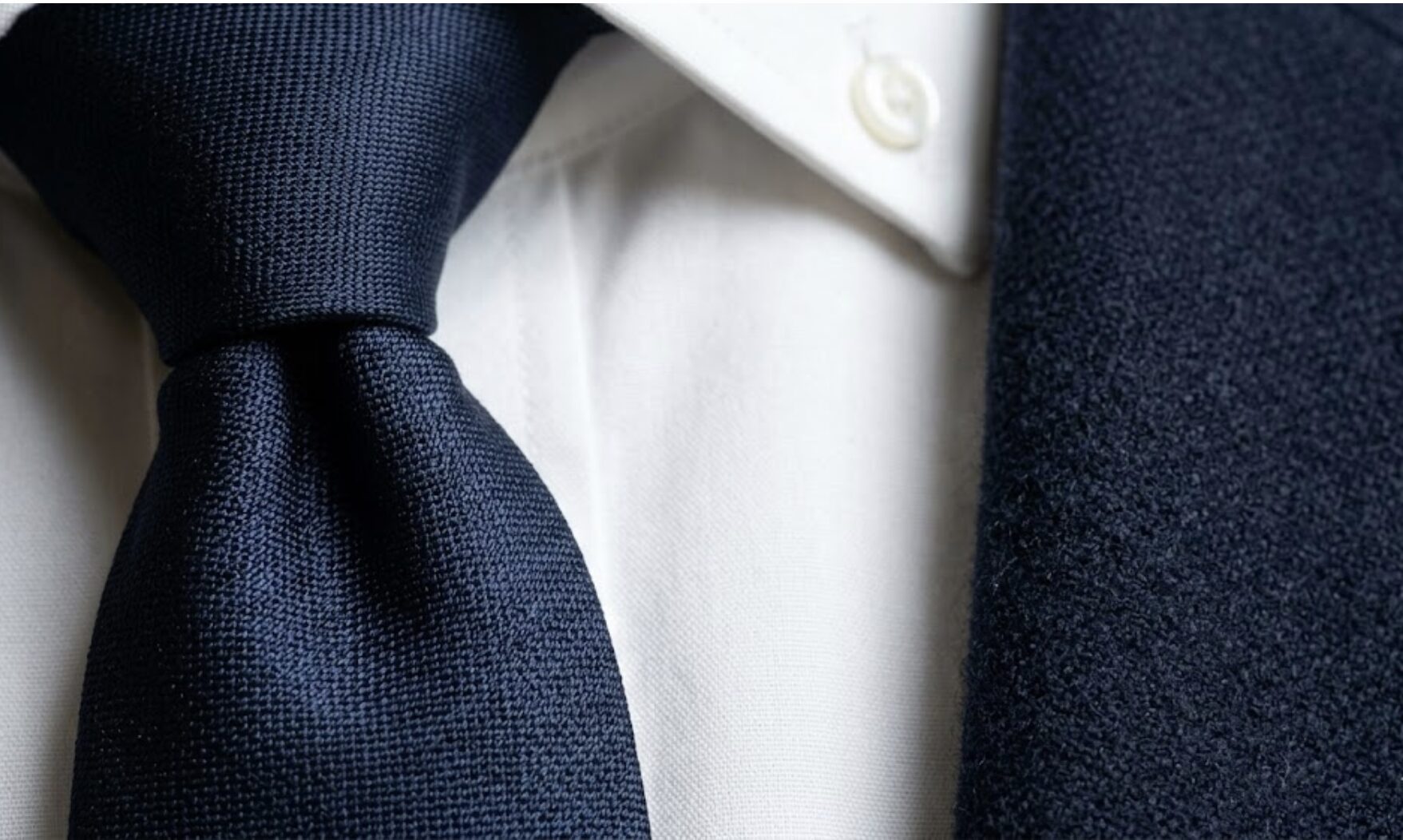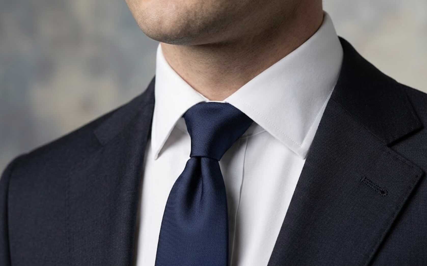 まずは、クローゼットにある派手な柄物のネクタイを一度脇に置いて、上質なネイビーの無地タイを、丁寧に結んでみてください。