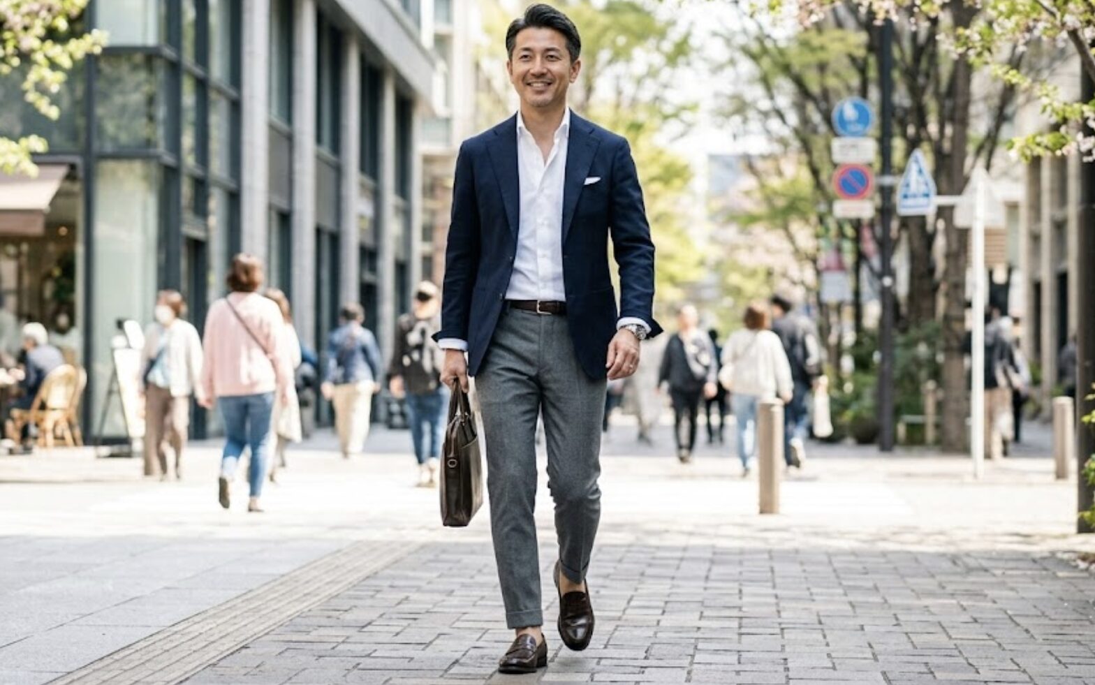 例えば、肩のラインがしっかりしたネイビージャケットに、足首に向かって細くなる「テーパードパンツ」を合わせます。