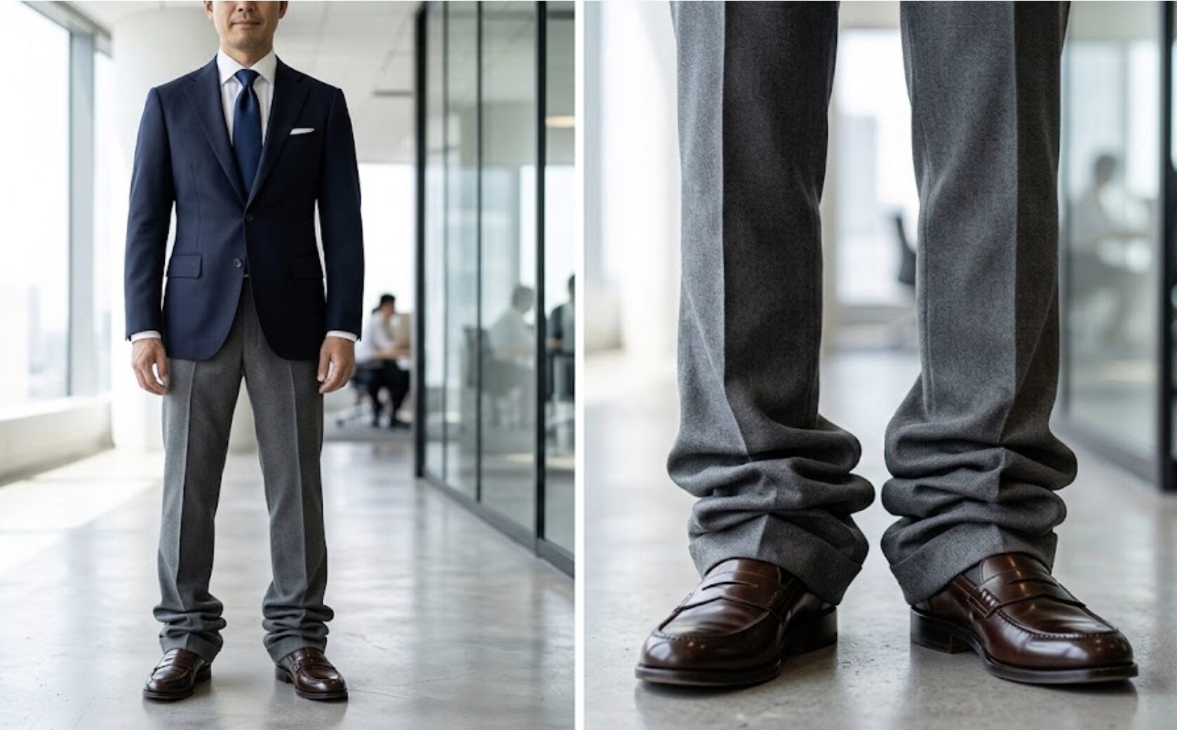 これは、上下の服の色を統一する(例えば、ネイビーのジャケットにネイビーのスラックスを合わせる)ことで最も効果を発揮します。