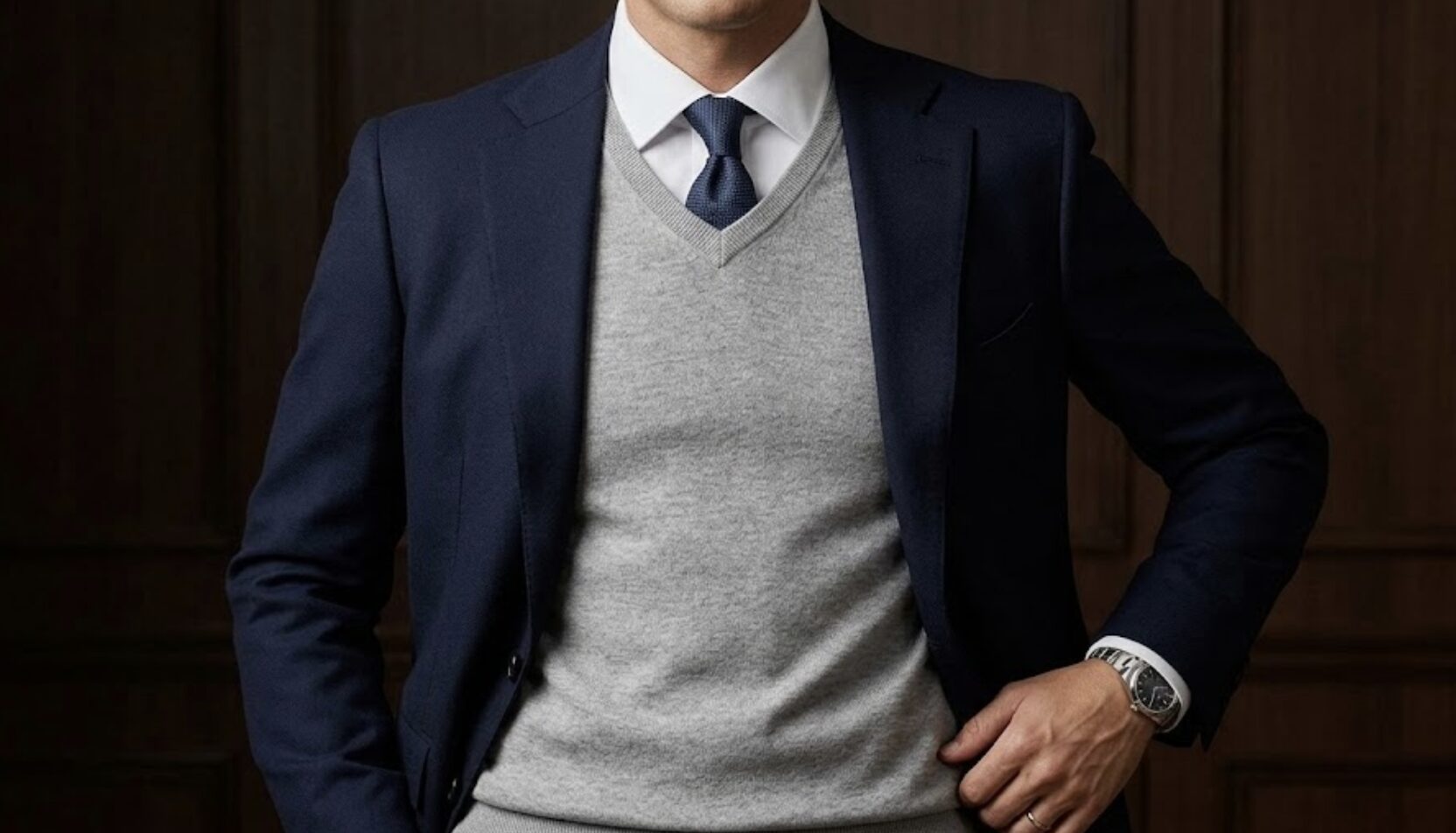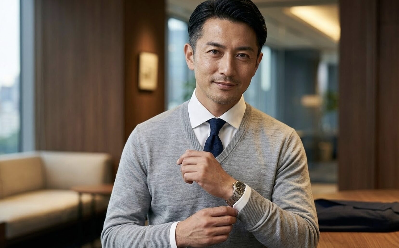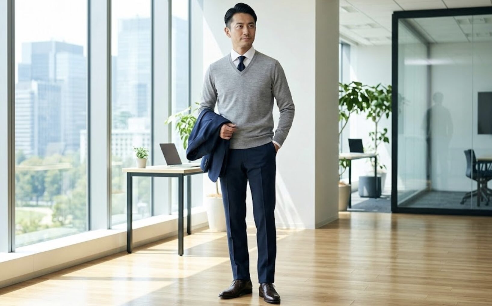 ネイビージャケットの中にライトグレーを挟むことで、冬の重苦しさが消え、Vゾーンにパッと春らしい明るさが生まれます。 (もちろん、同系色でまとめるネイビーのニットも、引き締まって見えるため確実な選択です!) - 襟の形は「Vネック」か「カーディガン」: