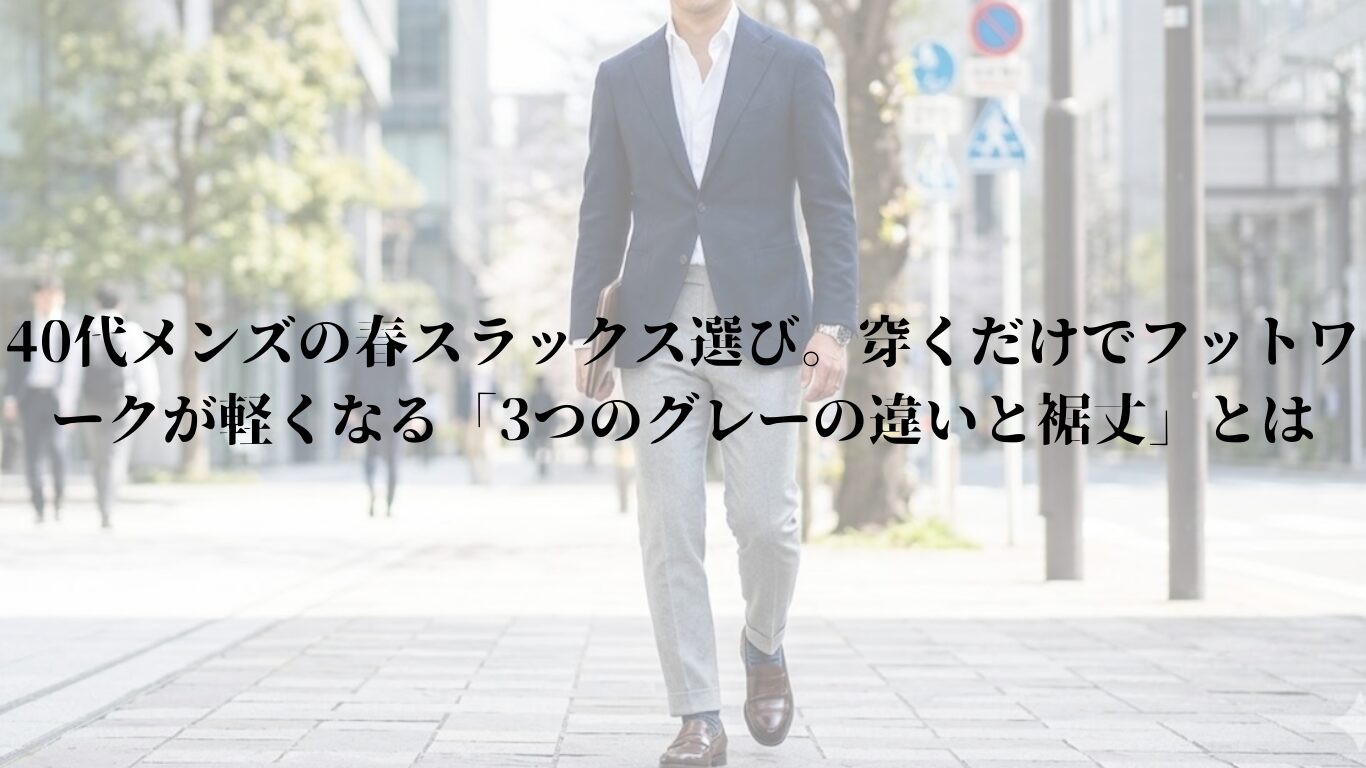 今回は、冬の重苦しさを一掃し、40代のビジネススタイルを一気に春らしくアップデートする「ライトグレースラックス」ついて、お話しします。