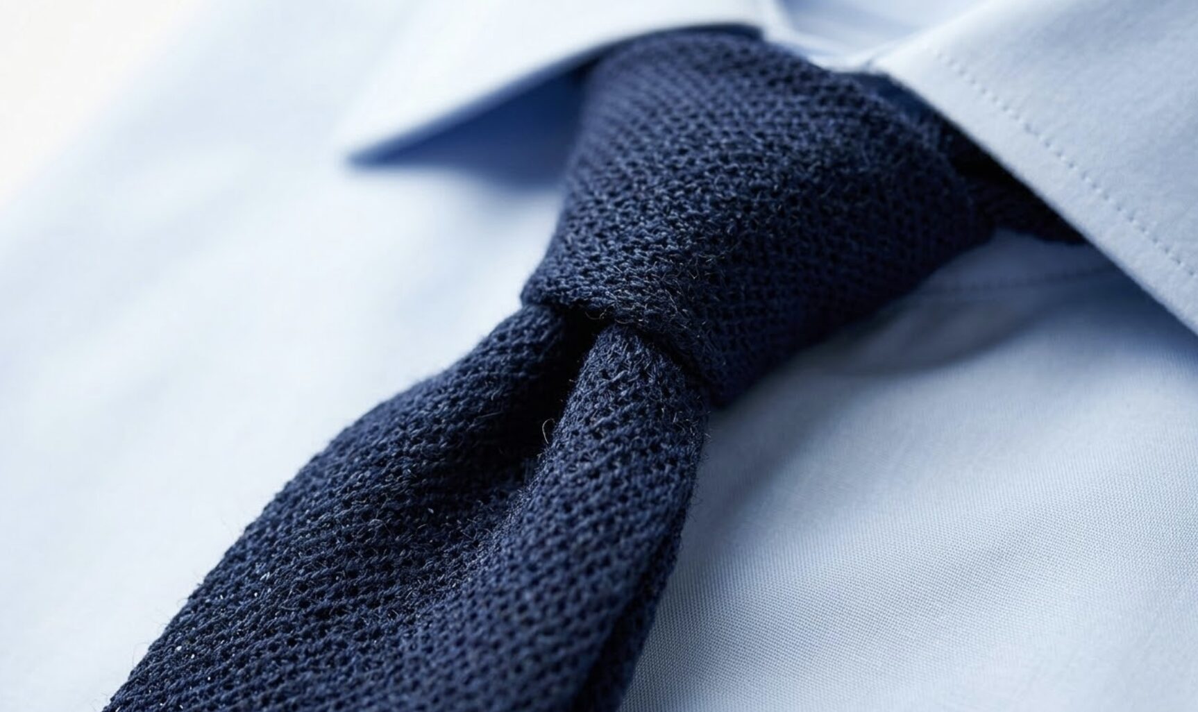前回の記事で「サックスブルーのシャツには濃紺のネクタイが合う」とお話ししましたが、その濃紺のネクタイの“素材”をフレスコに変えるだけです。