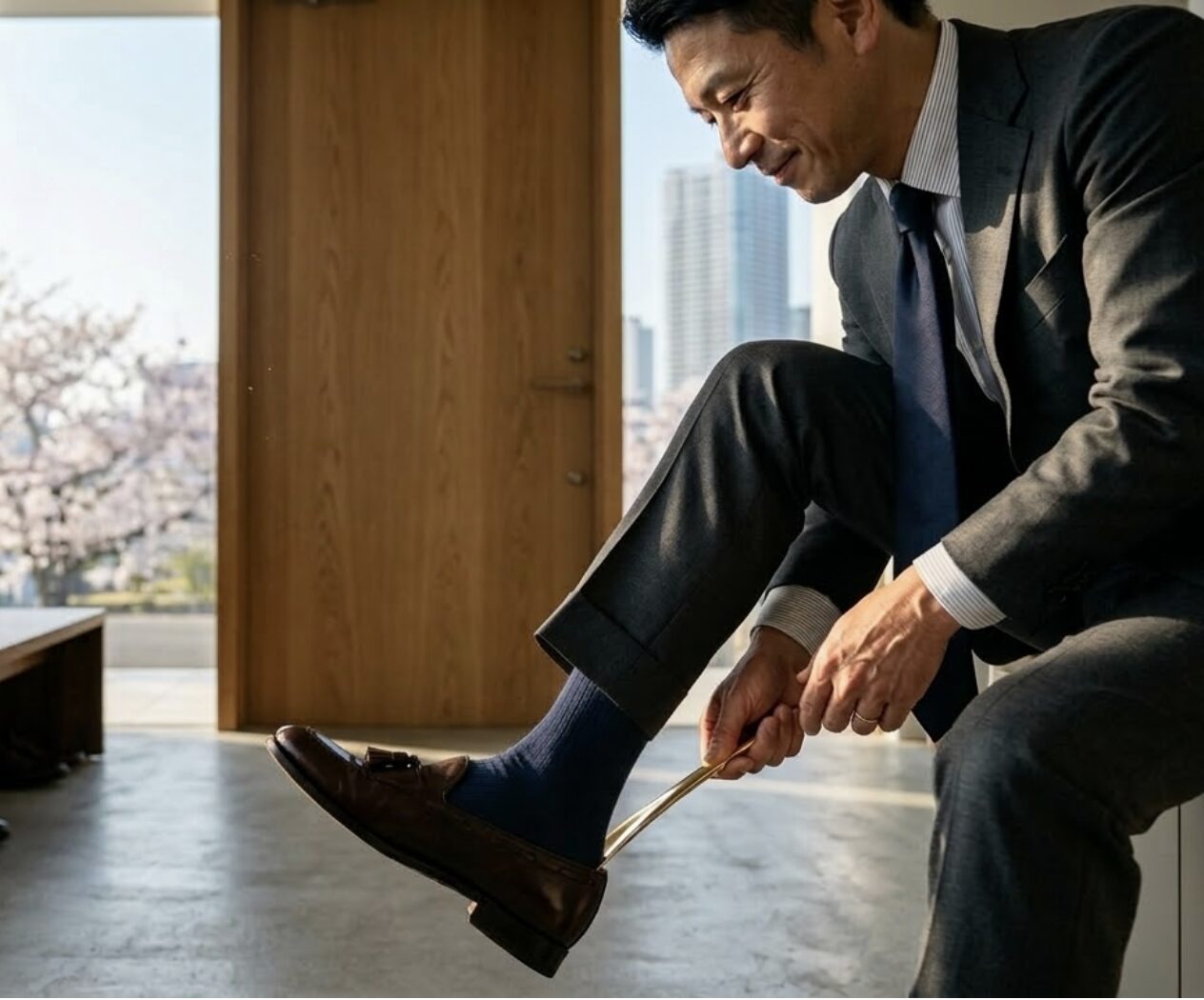 ウールで上下が揃ったカッチリとしたスーツに、普通のカジュアルなローファーを合わせるのは少し危険です。(大事なビジネスの場では、足元だけ軽薄に見えてしまうことがあります)