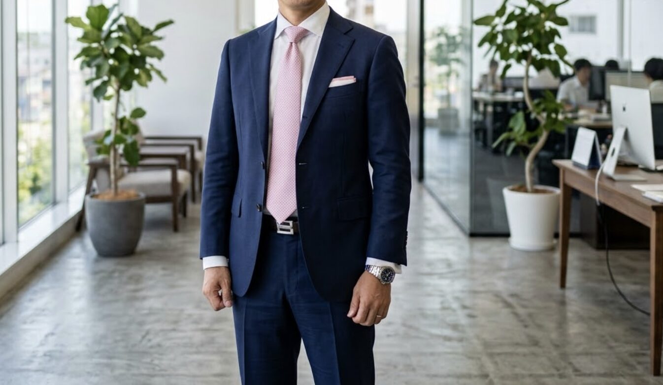 上品なツヤのあるシルク素材を合わせることで、相手に爽やかな印象を与えられます。 - ネクタイの長さは「ベルトのバックルに当てる」 ネクタイの先端(大剣)が、ベルトのバックル(金具)のちょうど当たるくらいの長さに調整してください。
