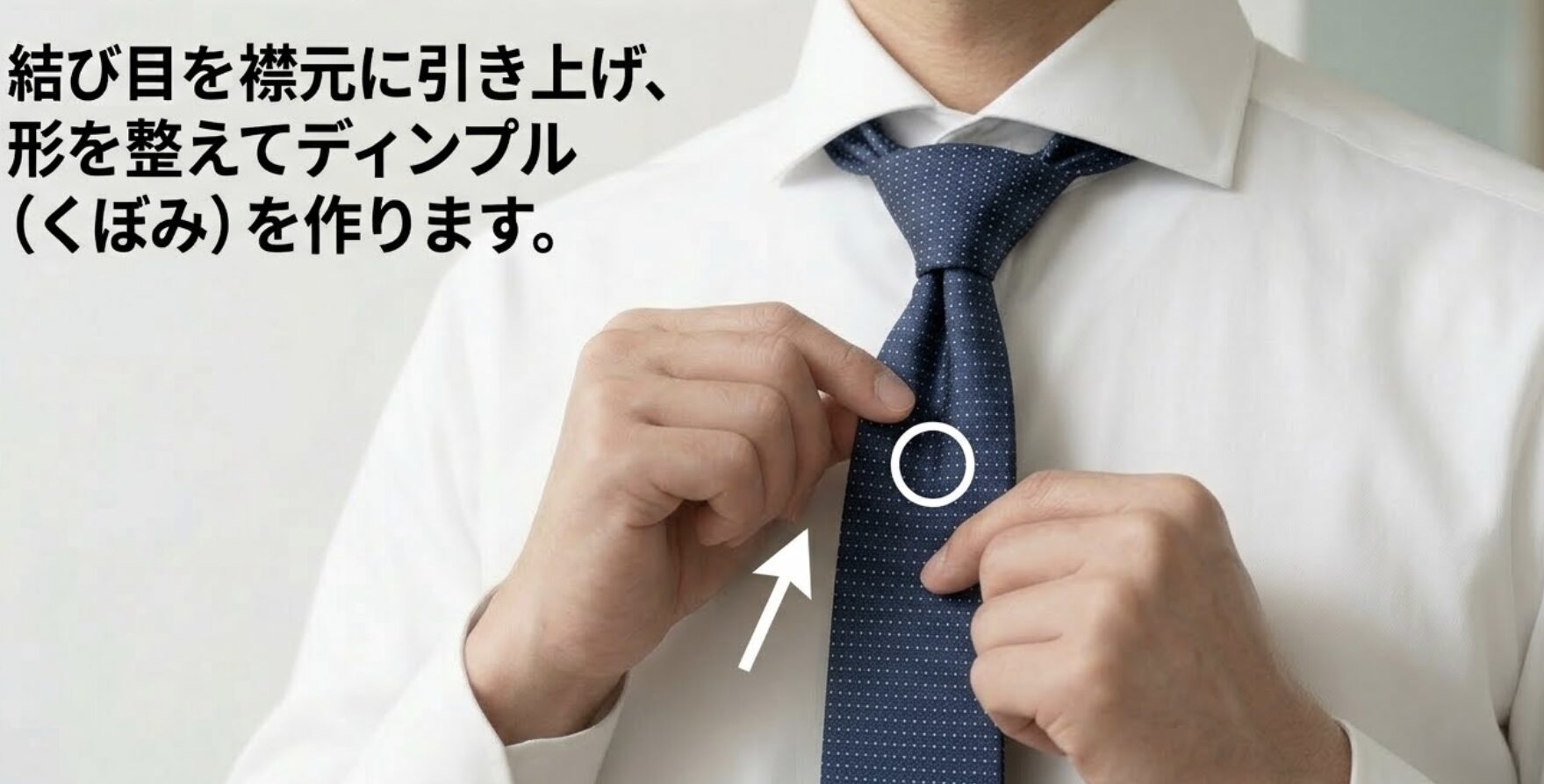 これより短いと子供っぽく見え、長すぎるとだらしない印象になります。 - 結び目の下に「ディンプル(くぼみ)」を作る