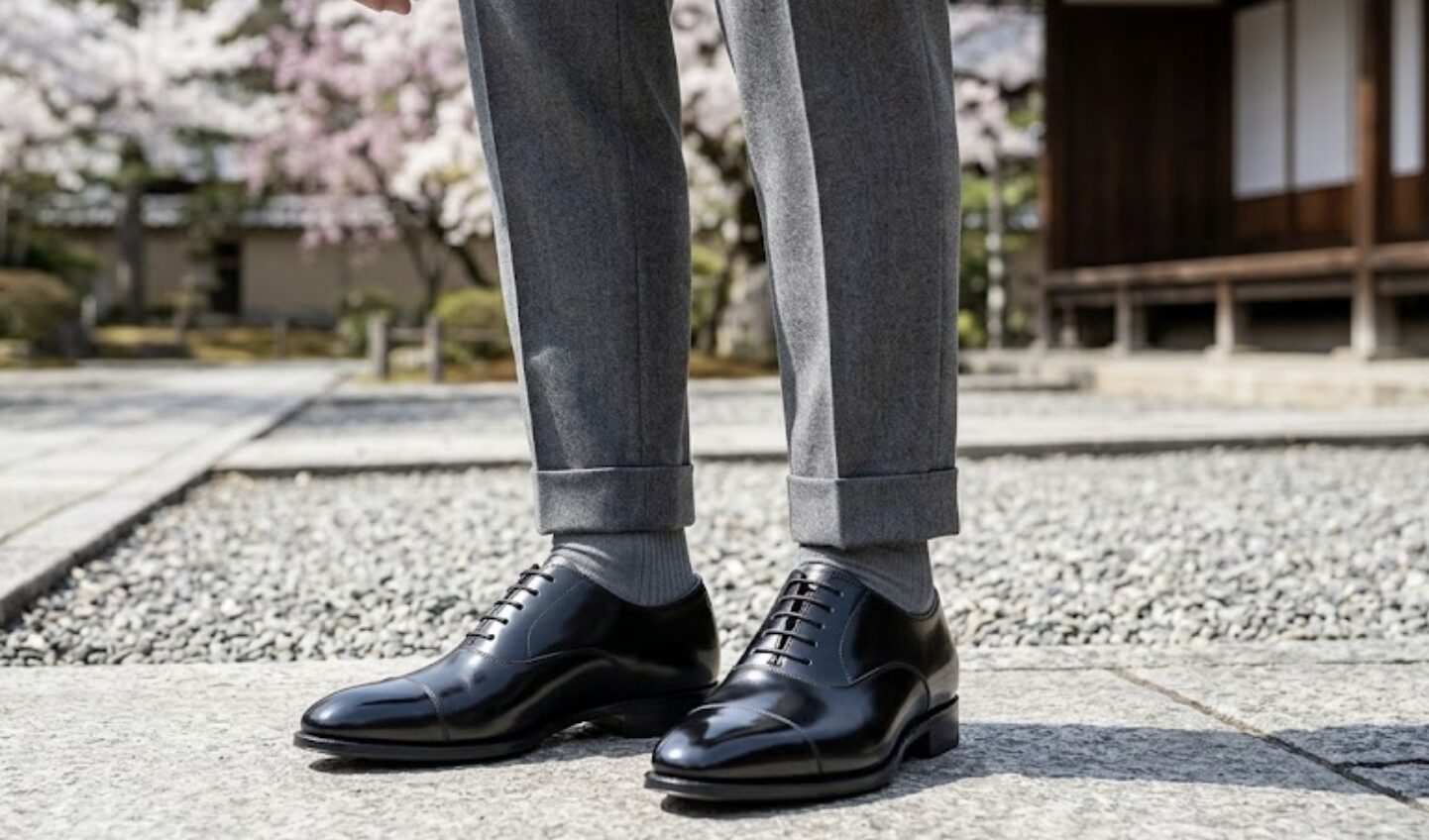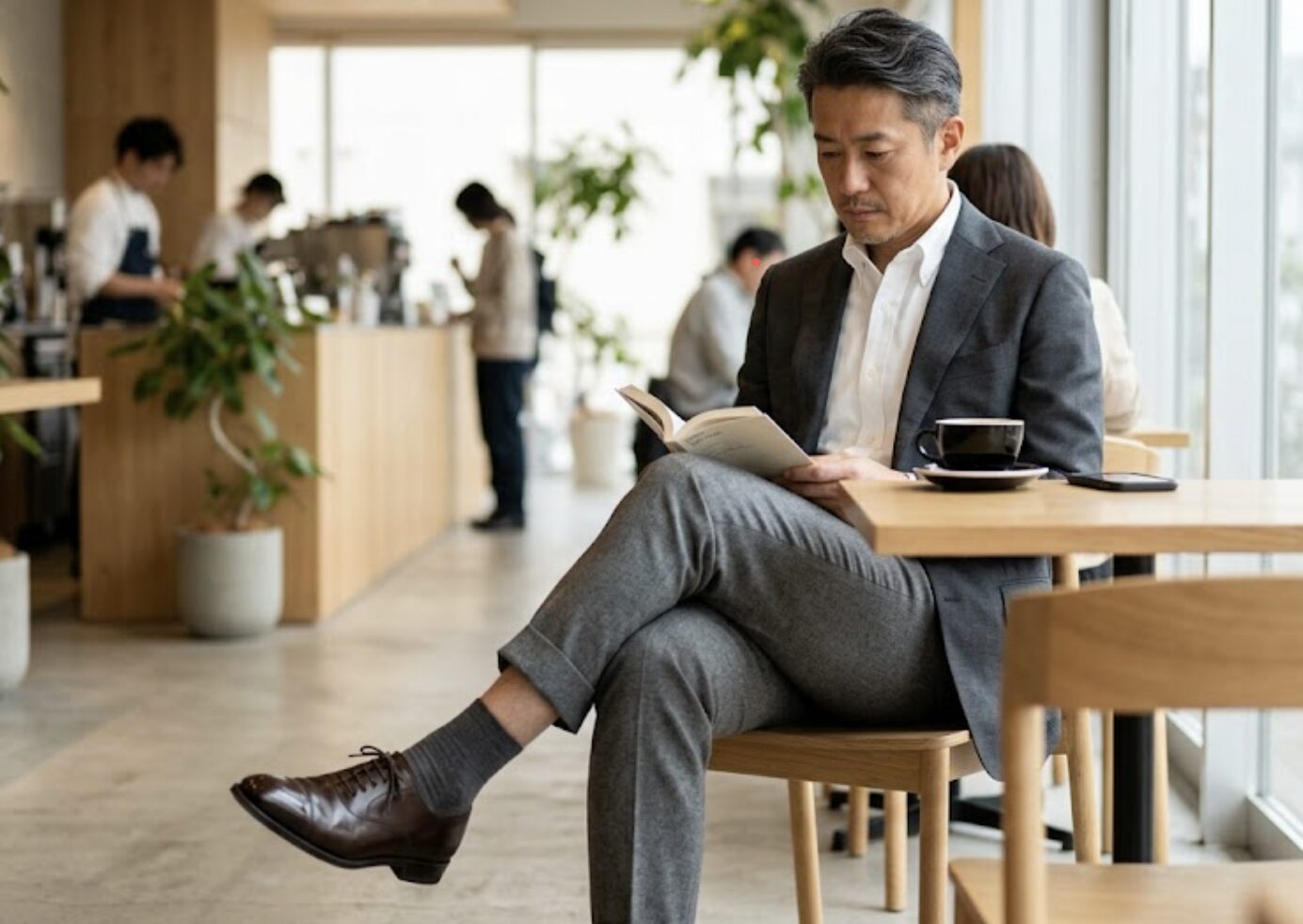 こういったサラッとした素材の靴下に切り替えるだけで、グレーのテーパードパンツの足元がさらにシャープに引き締まり、高級な革靴のツヤ感とも見事にマッチします。