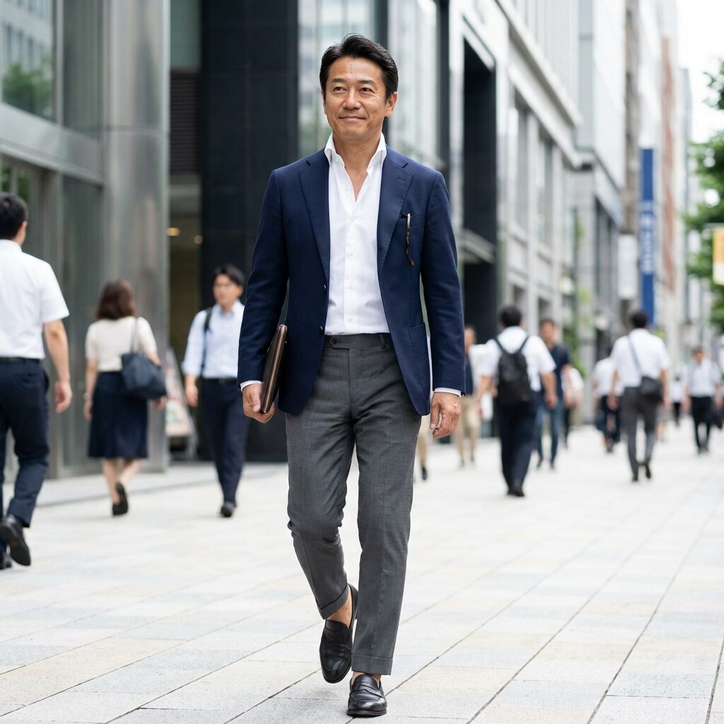 ネイビージャケットに、ミディアムグレーのスラックス。